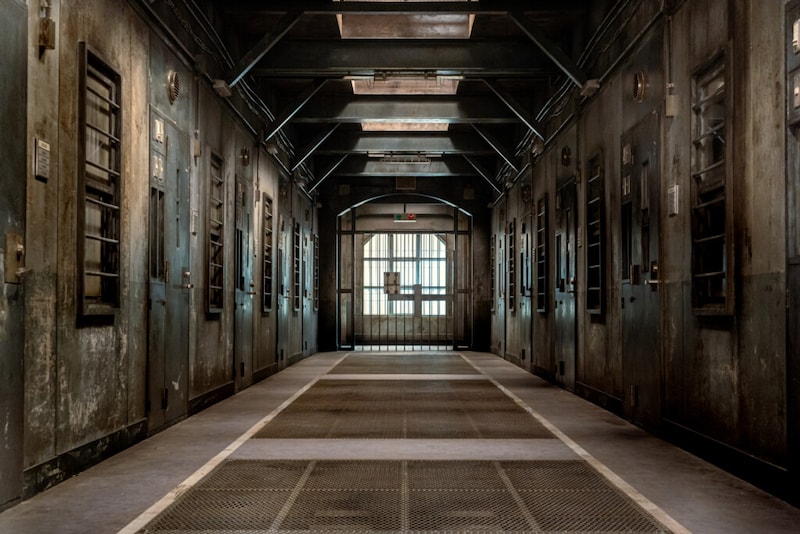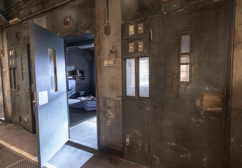 今回解禁されたセットは、日本国内に実在した古い監獄を参考に作られたもので、鉄扉が何重にも設置され、鉄筋がむき出しの高い天井からライトが薄暗く廊下を照らしている。