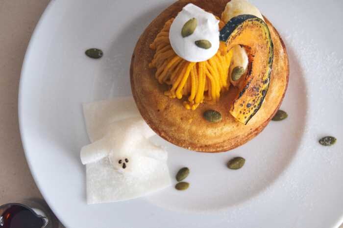 ふっくらパンケーキに重なるのは、かぼちゃの濃厚なペーストと特製メープルカスタード。仕上げに甘いメープルソースをたっぷりかければ、香ばしさとまろやかさが口いっぱいに広がります。