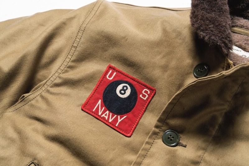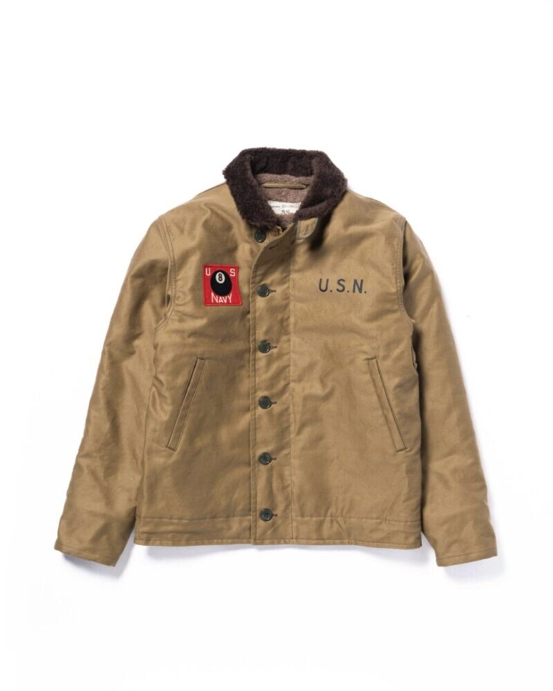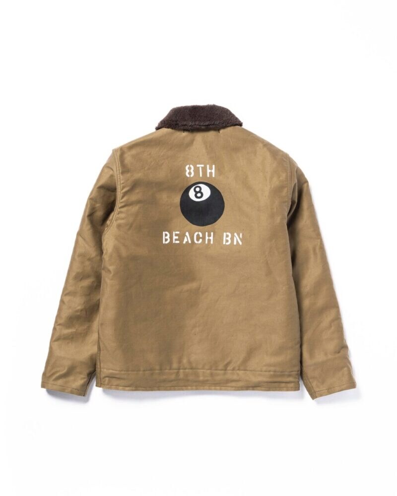 右胸に施されるUS NAVYと記された“エイトボール”のエンブレムは、陸海問わず多くの部隊で使用されていた定番のモチーフであった。当デッキジャケットは、第二次世界大戦中の水陸両用作戦、特に南フランス侵攻作戦で活躍した米海軍第8海岸大隊を想定。俗に言うN-1カーキに、「記念品としてエイトボールのデコレーションを施した」という設定のもと製作されたモデルである。