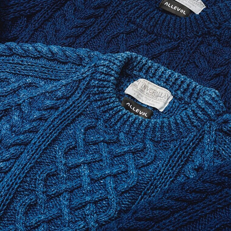 日本人ディレクター岡部隆志がイギリスで立ち上げたアレヴォル。最高品質を目指して、イギリスや日本でのモノづくりを行なっている。スコットランドの名門ニッターに別注している定番のインディゴコットンニットは10年以上続く定番人気商品。ブラックインディゴも展開する。69,300円(CLUTCH TOKYO https://clutch-tokyo.jp)