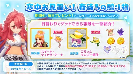 さらに、ポーションが手に入る「秘境探検応援プロジェクト」や、新頭装備「スイート・ティアラ・ケーキ」「ごろっとマンゴー帽子」が手に入る「寒中お見舞い!春待ちの贈り物」など、豪華報酬が手に入るイベントが盛りだくさんとなっています。