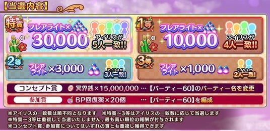 【準特賞】フレアライト×15,000 … 編成したアイリスが4人一致+ラッキーアイリスと一致