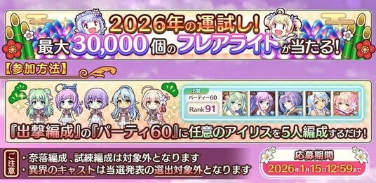 2025年12月26日 0:00より、最大30,000個のフレアライトが当たる『あいミス編成くじ2026』を開催いたします!