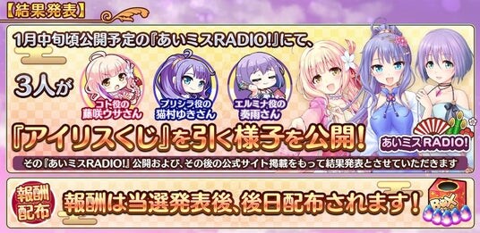 1月中旬頃公開予定の『あいミスRADIO!』にて、コト役の藤咲ウサさん、プリシラ役の猫村ゆきさん、エルミナ役の奏雨さんが『アイリスくじ』を引く様子を公開!