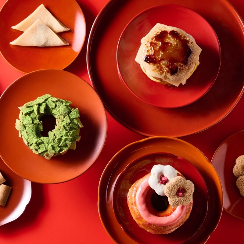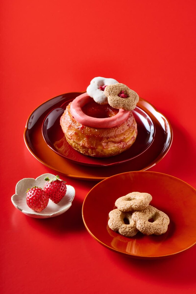今回発売されるのは、京都の老舗和菓子店「井筒八ッ橋本舗」とコラボレーションした「yatsuhashi donuts」。それぞれ京都らしい食材を使用し、新年を祝う“おめでたい”見た目に仕上げています。