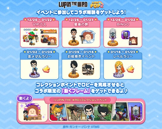 LINEヤフー株式会社は、当社が展開する6角形パズルゲーム「LINE POP2」(iPhone・Android対応/無料)において、12月26日(金)よりTVアニメ『LUPIN THE IIIRD』とのコラボレーションイベントを開催します。