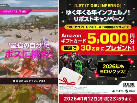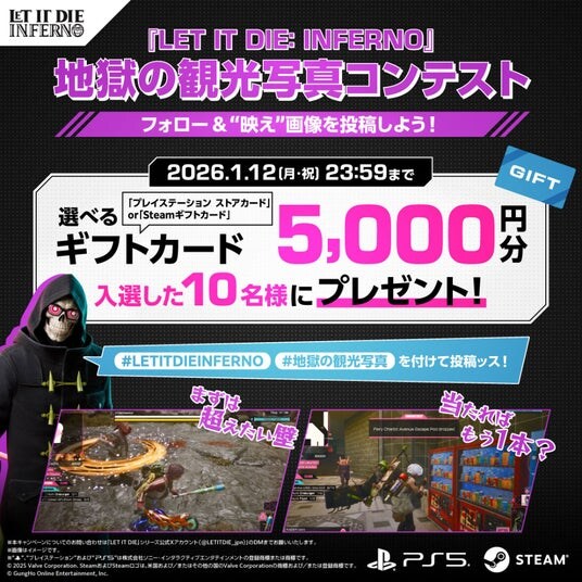 ガンホー・オンライン・エンターテイメント株式会社(本社:東京都千代田区、代表取締役社長 CEO 森下一喜)は、スーパートリック・ゲームズ株式会社(本社:東京都千代田区、代表取締役 石川周志)とタッグを組んで展開中のローグライトサバイバルアクションゲーム『LET IT DIE: INFERNO(読み:レットイットダイ インフェルノ)』にて、年末年始を熱く盛り上げる2大SNSキャンペーンを実施いたします。