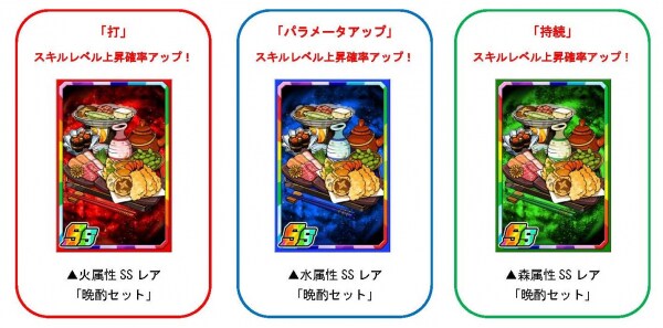 「忘年会P」を使い素材ガチャを回すと、限定の強化素材「晩酌セット」を手に入れることができます。一部のモンスターに使うと強化値2倍の効果があるほか、打・パラメータアップ・持続のスキルレベル上昇確率もアップします。
