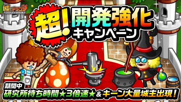 キャラ育成がはかどるキャッスルイベント「研究所待ち時間半減キャンペーン」と、バトルイベント「キーン大量城主出現キャンペーン」を開催いたします。