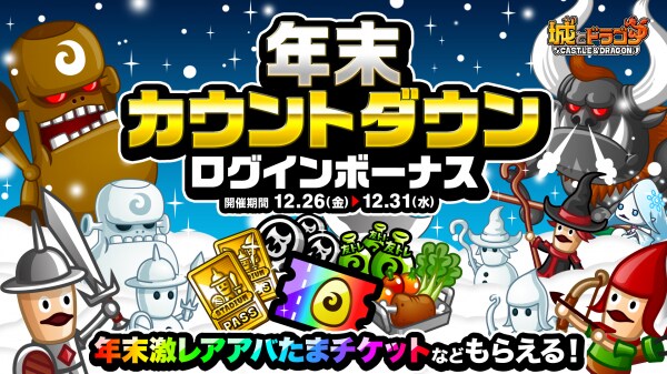 12月26日(金)19:00より、年末激レアアバたまチケットなどが入手可能な「年末カウントダウンログインボーナス」と「年末カウントダウンミッション」が開催!キャラ育成がはかどる「超!開発強化キャンペーン」や、城下町でフードやキーンをたくさん獲得できるようになる「爆速収穫キャンペーン」といったお得なキャンペーンも併催されます。