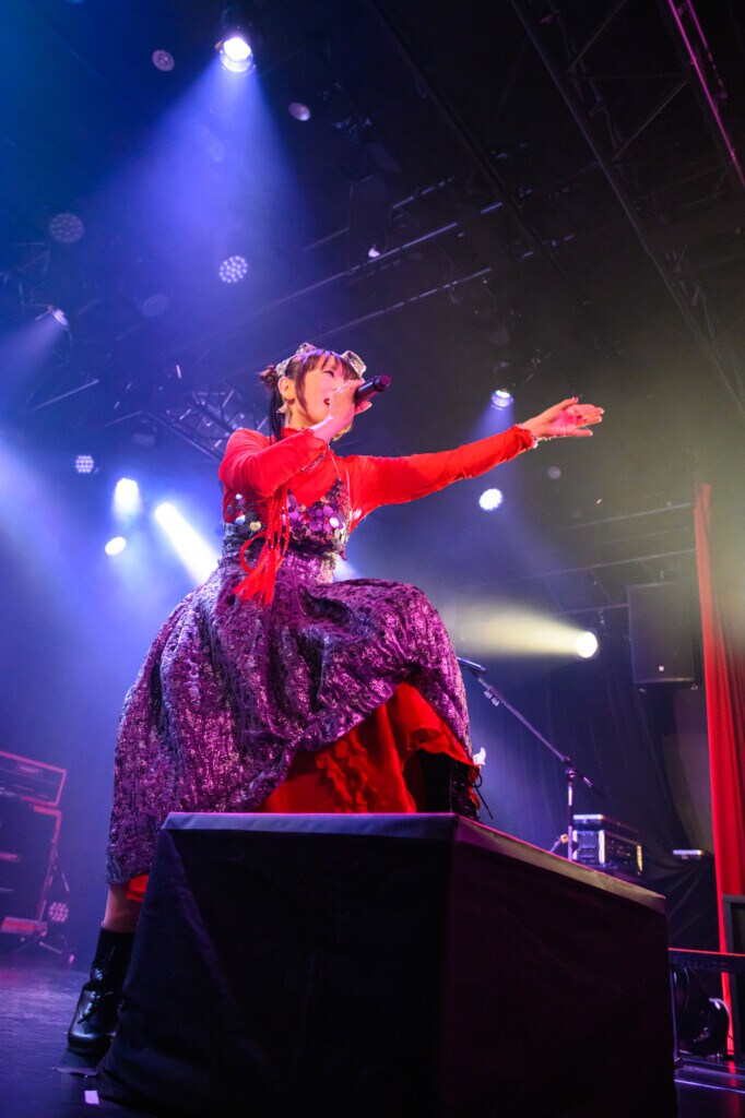 最初の楽曲はアルバム「Answer」から新曲「不器用なI love you」。ミドルテンポの楽曲で、音源では主題歌作品(TVアニメ「不器用な先輩。」)に合わせ、シティポップなサウンドメイクが印象的だったが、ライヴではきれいなバンドサウンドに。この公演を通じてドラムの鳴りとベースの響きが良いバランス担っていたのが印象的だ。atsukoはステージ上からフロア前方の観客一人一人を指差し、アイコンタクトと手振りを早々に行うサービスぶりだ。ステージ上にはお立ち台があり、登って歌い上げたりポージングに使ったりと、距離の近さを感じさせる。サビでは全員が大きく左右に手振りをするなか、グッズのLEDラバーブレスレットが色とりどりに輝いた。2曲目はアグレッシブな「DEAD OR ALIVE」。これまでライヴの中盤に歌われることが多かった楽曲だが、ここで早くも投入されると、ハイスピードなリズム隊が一気に盛り上げにかかる。間奏の「Follow me Follow you」でコール&レスポンスをする場面では、男子/女子にそれぞれ歌わせる展開があるが、今回の公演では女性限定エリアが広く取られており、そこに向けてマイクアピールすると大勢の黄色い声が挙がっていた。最初のMCでもそこに触れると、エリア以外の女子も懸命に存在をアピール。atsukoはお立ち台に座ってコミュニケーションを取るなど、ライブハウスならではのスタイルでステージを進めていく。