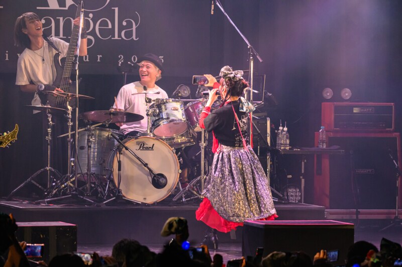 MCでさらにatsukoは、angelaの目標の1つである「ぢぇらフェス」開催への構想を語った。デビュー20周年をきっかけに「桃太郎のまち岡⼭⼤使」と「はだか祭りのまち西大寺ふるさと大使」に就任したangelaは以降、地元・岡山との関係が深まり、この後に歌った「正面突破 We are!」など岡山にまつわる楽曲を制作している。交友関係が広いangelaは誰を呼べばぢぇらっ子が喜んでくれるかをアンケートするべく、客席に呼びかけたところ、判別がつかないほどの多彩な声が飛び交い、改めてぢぇらっ子の間でも期待の高さを感じさせた。その後、このツアーを振り返るトークの中でatsukoは岡山公演を、KATSUは北京・上海公演を思い出として挙げた。その後、蒼井翔太とのデュエット曲「晴れのちハレルヤ!」では、蒼井のパートをぢぇらっ子が歌うことで再現するなど、パーティー感溢れる空間を作り出した。サッカーJ1リーグの「ファジアーノ岡山」に向けた応援ソング「正面突破 We are!」では、チームカラーに合わせた赤いライトのなか、客席にマイクを向けて歌わせ拳を突き上げたり、BuonoとKATSUがヘドバンをするアグレッシブな演出を繰り出し、最後にはサイン入りのミニサッカーボールを投げ入れるファンサービスも行った。メロディアスなイントロに客席が沸いた「Fly Alive」はそのボルテージの高さのまま突っ走り、シンセのハイスピードに生のドラムがぶつかり合い、勢いをつけサビではコール&レスポンスがこだまする。ギターソロも力強く、満足度の高い一曲となった。