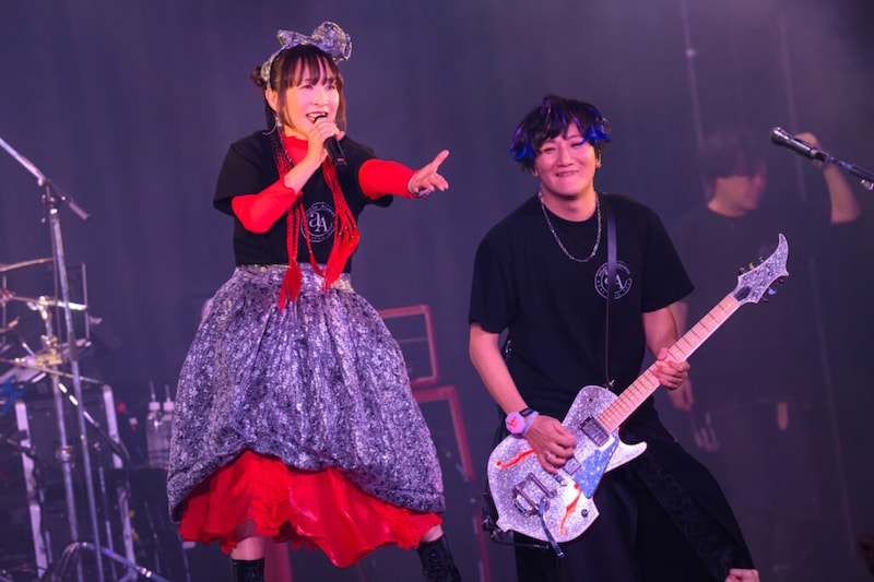 ポップな側面をさらに開拓した「乙女のルートはひとつじゃない!」の後は、ライヴではレアなトラック「未来とゆう名の答え」を披露した。これは2005年のアニメ『JINKI: EXTEND』のエンディング主題歌。MCでの解説によると、当時もがき苦しんでいたなかで表現した“未来”が、20年経って“今”になったという答え合わせになったという。耳に残る上下移動のメロディやキメタメのあるコーラスなど、ドラマティックな演出が多めの楽曲で、若々しい特徴が現れた楽曲を、現在の堂々とした歌いまわしで表現する。こうしたステージングもキャリアの答えの一つと言えそうだ。