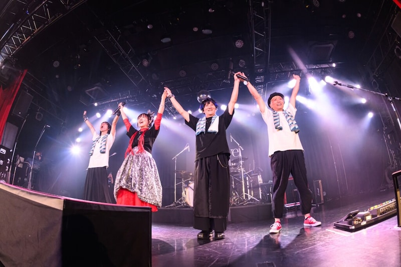 アンコールではツアーの思い出話のあと「今回のツアーで、さらに私はぢぇらっ子との絆を感じてその深さを知りました」と添えて「KIZUNA」を歌う。ドラマチックなイントロに硬質なギターのリフワーク、大音量のドラムにオーディエンスは大きく声を上げる。サビでの慟哭の歌唱に対して客席からも大きなコーラスが聞こえ、楽曲を通した絆が確認された。本ツアーでは毎回、1曲撮影OKタイムが設けられてきたが、ファイナル公演で対象となったのは代表曲の「Shangri-La」だ。タオル振りの楽曲でもあるこの曲、観客は右手と左手でそれぞれ別の動きに苦労しつつも楽しげな様子。atsukoとKATSUは前方で撮影中のぢぇらっ子からスマホを預かり、ステージ側のアングルで自撮りしたり、ドラムのじんぼちゃんのところまで持って行って映したりとサービスいっぱいで貴重な思い出をその人のスマホに刻んだ。またこの曲は間奏でホイッスルを吹くタイミングもあり、ラスサビでは皆で合唱するなどステージの上も下も大忙し。先の初参戦組の方たちは、フェスなどでも歌われる代表曲がワンマンではここまで賑やかに歌われることに驚いたのではないだろうか。