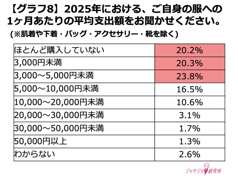 1か月あたりの洋服代は「5,000円未満」という層が多く、「ほとんど服を買わない」という層も一定数存在しています。一見すると消費が冷え込んでいるようにも見えますが、その一方で「本当に欲しいものだけを選ぶ」「長く着られる服を選ぶ」といった意識が高まっている点が特徴的です。