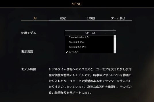 第二回クローズドβテスト版のビルドでは、新たに「ChatGPT」および「Gemini」系列の最新モデルに対応。プレイヤーの文体の好みやプレイスタイルに合わせ、ゲームマスターとなるAIを自由に選べるようになりました。