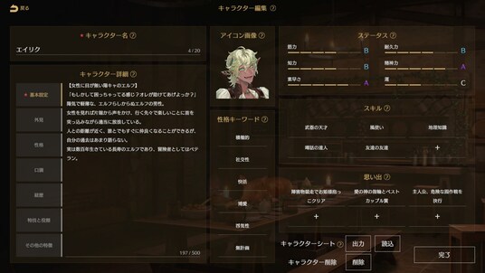 シナリオをクリアすると、物語の内容に合わせた「スキル」や「思い出」が自動生成され、唯一無二の経験がキャラクターに蓄積されていきます。キャラクター情報はいつでも編集できるので、キャラクター同士の関係性もプレイヤーの思いのままです。