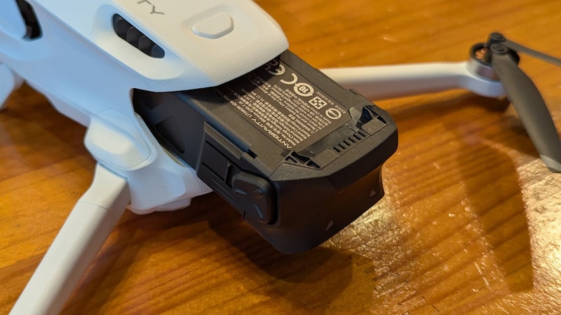側面のラッチを押して引き出すと、バッテリーが取り外せます。レビューしたインフィニティキットに付属する大容量バッテリーは容量4345mAh、重量は108.6gで、約39分の飛行が可能。通常バッテリーは容量2360mAh、重量67.5gで、約24分の飛行が可能です。