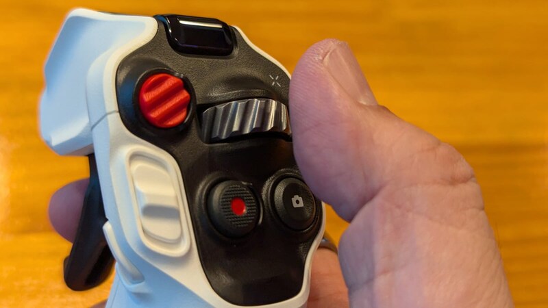 フロントには視点や方向の調整に使えるホイール状の「360ダイヤルボタン」、上昇・下降を操作するスライダースイッチ、録画ボタン、静止画のシャッターボタン、緊急停止や離陸地点に戻るRTH(Returen to Home)操作に使うボタンを搭載。