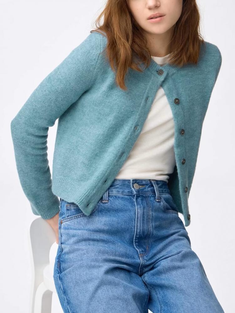 やわらかくチクチクしにくい触り心地がなんとも魅力的な、ニットのカーディガン。シンプルなクルーネックとコンパクトなサイズ感で着回し力の高い、万能な一着です。