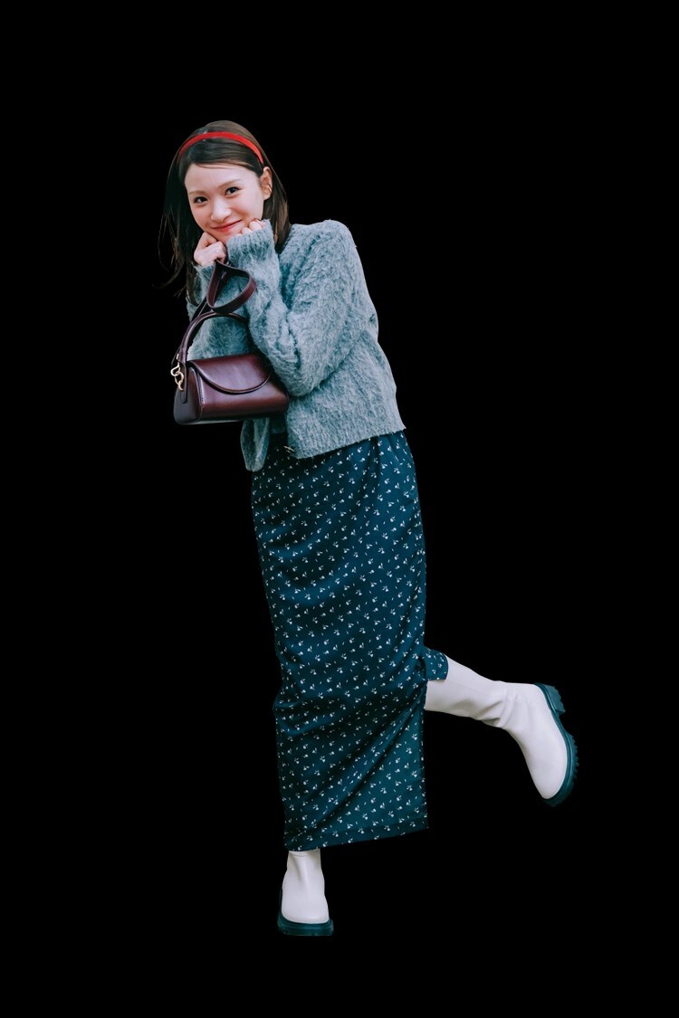 カチューシャやバッグの差し色でコーデにアクセントを。足元は白を選んで全体的に暗くならないようにするのがポイント。