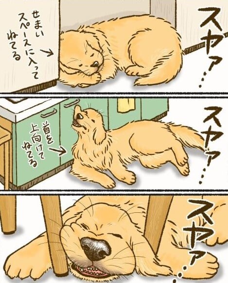 ゴールデンレトリーバーの「ケンちゃん」は、漫画家の8kanchi8さん(@8kanchi8illust)の実家で飼っているワンコです。ケンちゃんは、あらゆる生活の場面で「なぜ?」と思うかわいい行動をとるようです。少しでもスキマがあると……?
