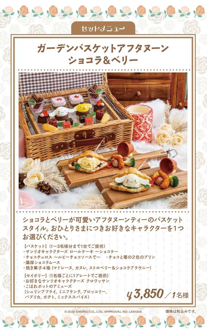 「ガーデンバスケットアフタヌーン ショコラ&ベリー」は、ボリューム満点のバスケットとセイボリープレートがセット♡好きなキャラクターのムースとクロワッサンを選べます。
