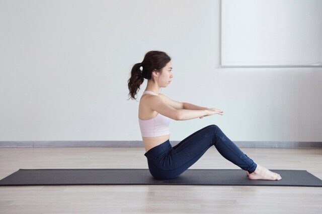 (1)脚を拳1個分を開けて床に座って背筋を真っ直ぐ(反り過ぎないように)、両腕は軽く前に伸ばしてボールを抱えむようなイメージで指先を合わせる