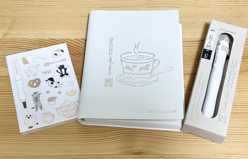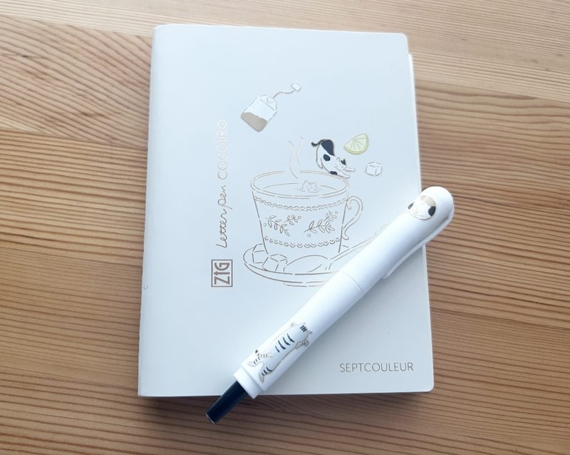「紅茶と猫」デザインの「マルマンセプトクルール〈A6〉」ノートとリニューアル新商品「ZIG Letter Pen COCOIRO」のセット。