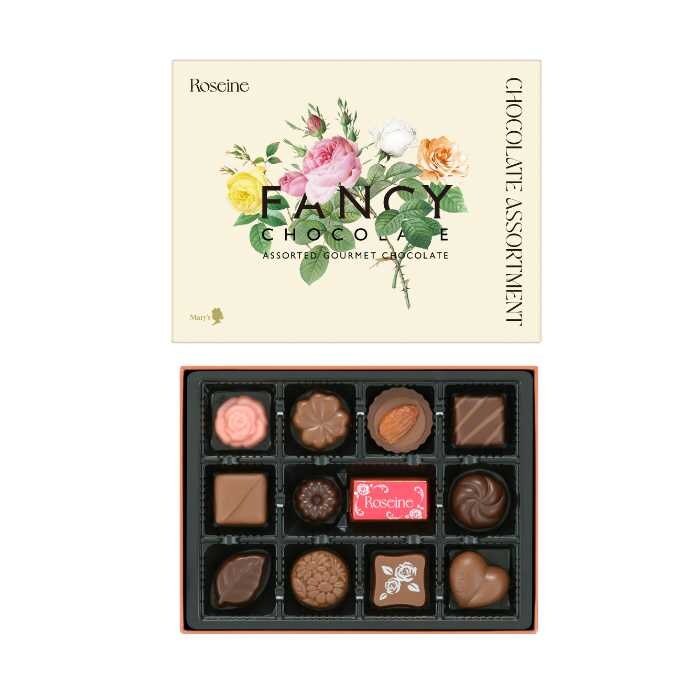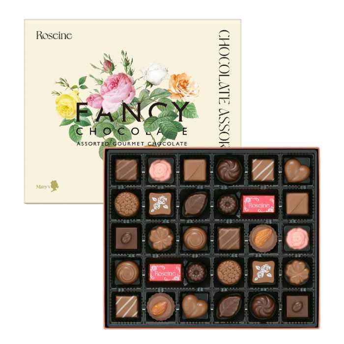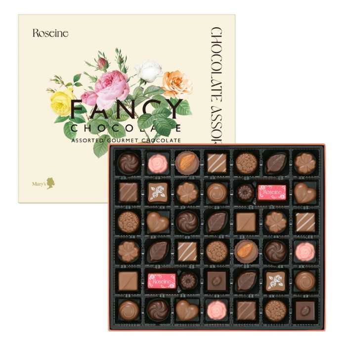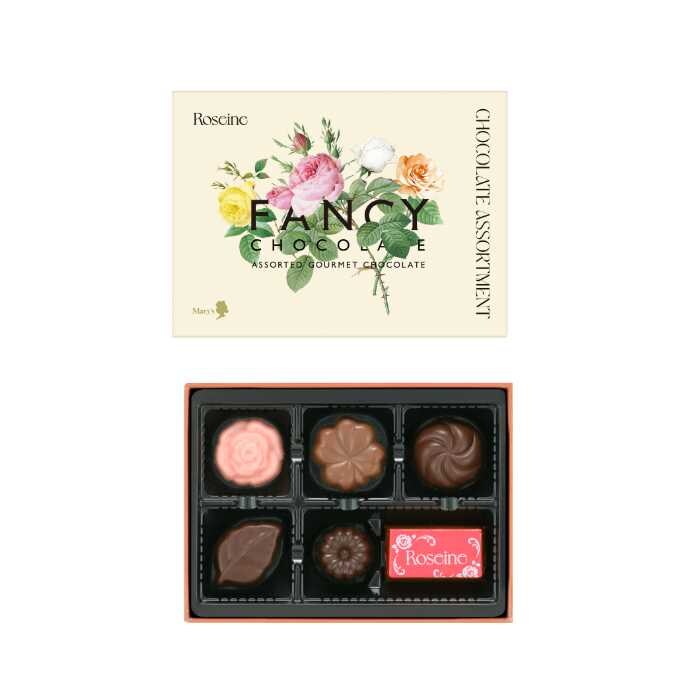 まず「ロゼーヌファンシーチョコレート」は、バレンタイン限定パッケージに包まれた15種の小粒チョコを詰め合わせた人気商品。