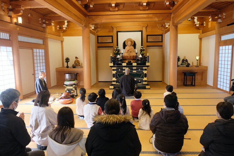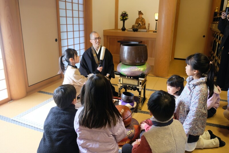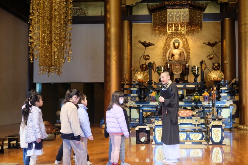 浄土宗の「南無阿弥陀仏」の教えも受け、木魚や鐘が読経のリズムを合わせるために使われることを教わり、僧侶とともに読経を唱えていく。触ってはいけないとされる木魚や鐘を一回だけ鳴らす体験もした。大殿へ向かう階段の手すりも、みんなで拭いてきれいにした。