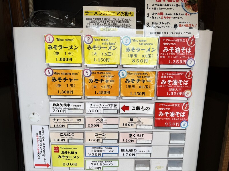 オープン間もない早めの時間に行ったためか、混んでいるものの、並ばずに座ることができました。まず最初に、野外にある食券を購入してから入店します。今回は味噌ラーメンにバター、コーン、ニンニクをトッピングしました。やっぱり、筆者的には、味噌ラーメンにバターコーンは欠かせないのです。