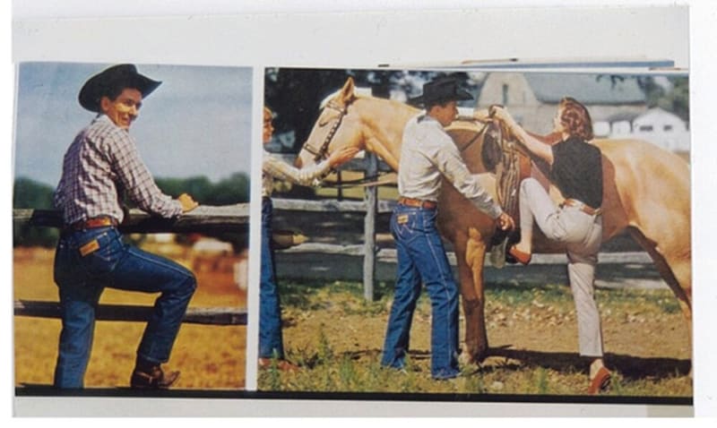 1957年の広告。この時代はカウボーイがアメリカの象徴のひとつとされており、彼らに愛されたラングラーはウエスタンジーンズの代名詞に。