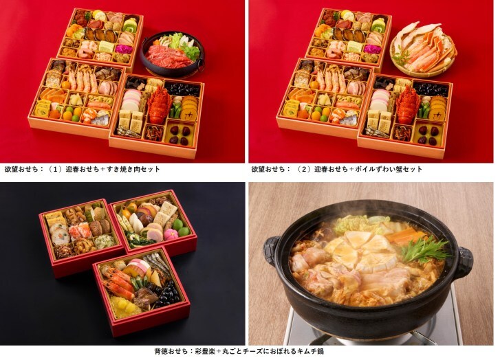 なかでも注目は、「欲望おせち」と「背徳おせち」というネーミングからしてインパクトのある2商品だ。「欲望おせち」(19,500円(税込21,060円)) は、京都祇園の老舗「ぎをん や満文」が監修した三段重に加え、宮崎牛(A5ランク)すき焼き用350gまたはボイルずわい蟹400gがセットになった豪華仕様。一方の「背徳おせち」(16,500円(税込17,820円))は、三段重のおせちに加え、丸ごとカマンベールチーズが入ったキムチ鍋がセットになっており、おせちの後の“もう一品”としても楽しめる構成になっている。