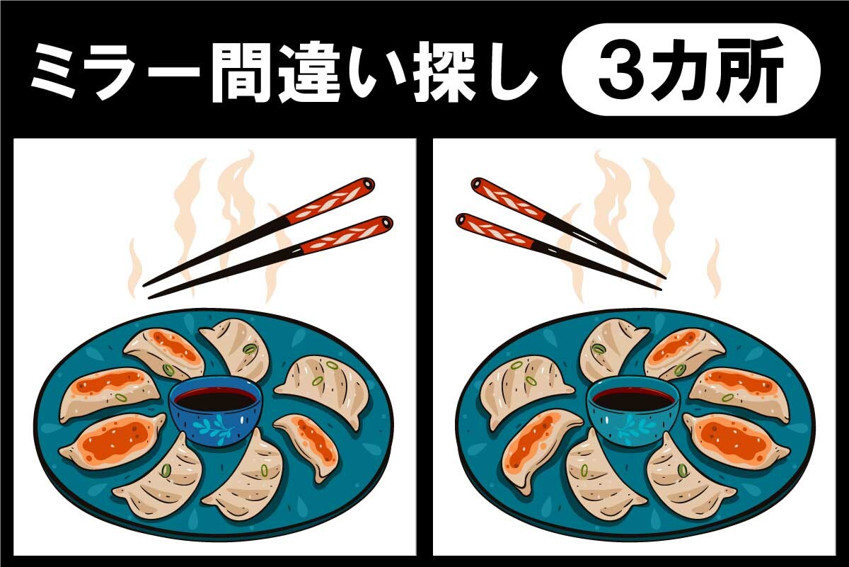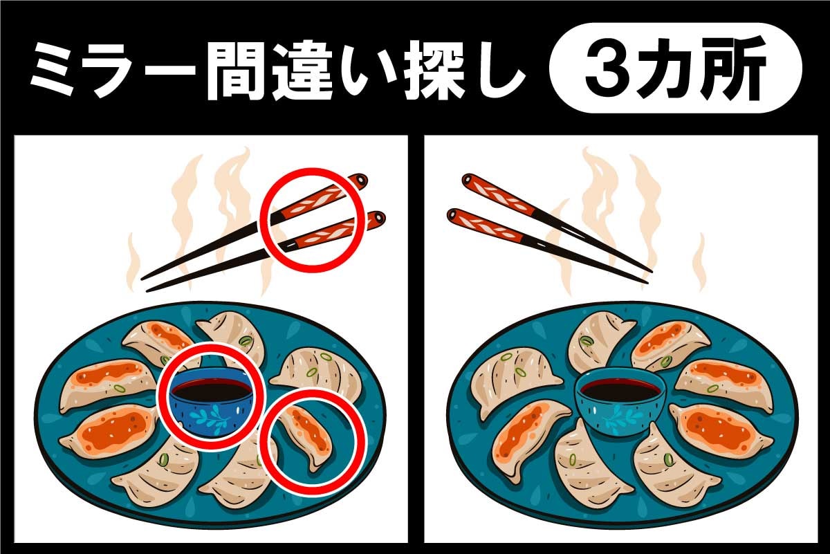 3カ所の違いは、1.餃子の大きさ、2.箸の長さ、3.中央の容器の色