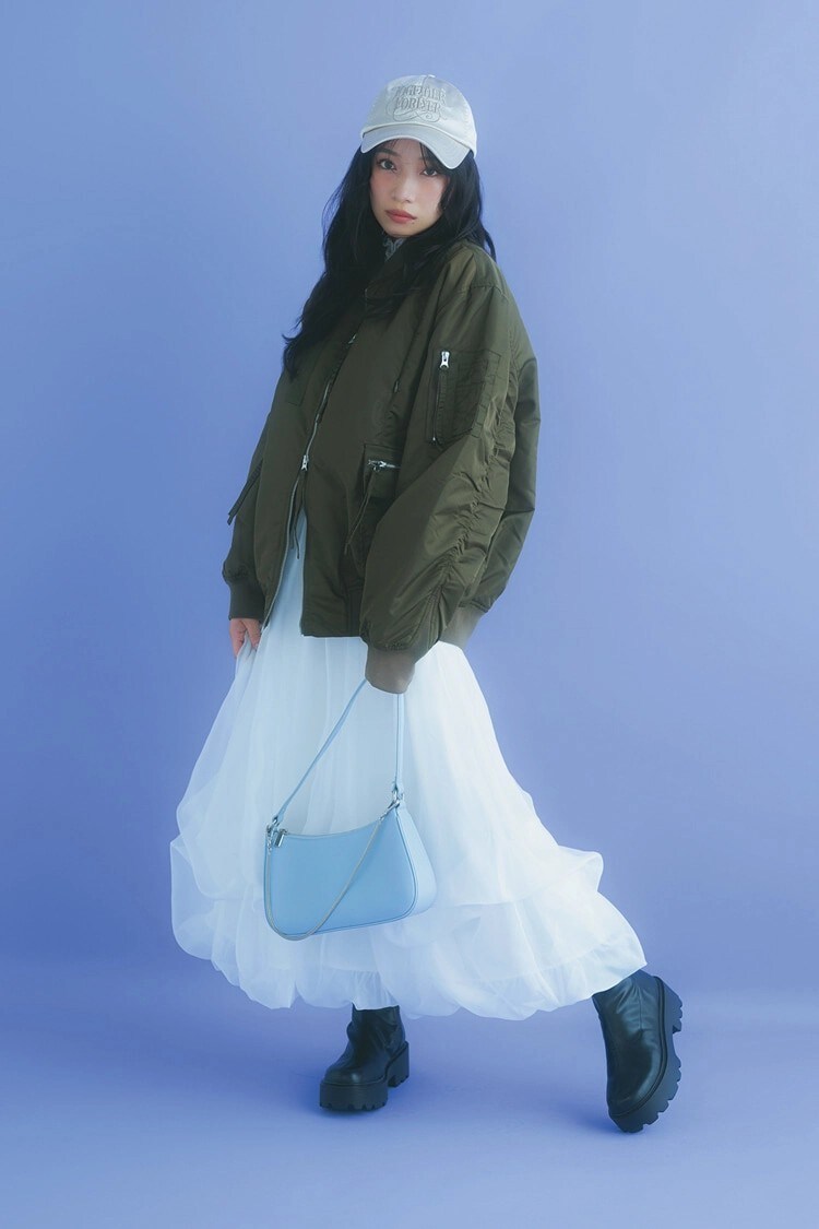 ギャルみのあるMA-1とサイドゴア、サテンのキャップに甘さのあるスカートのチグハグ感が絶妙。