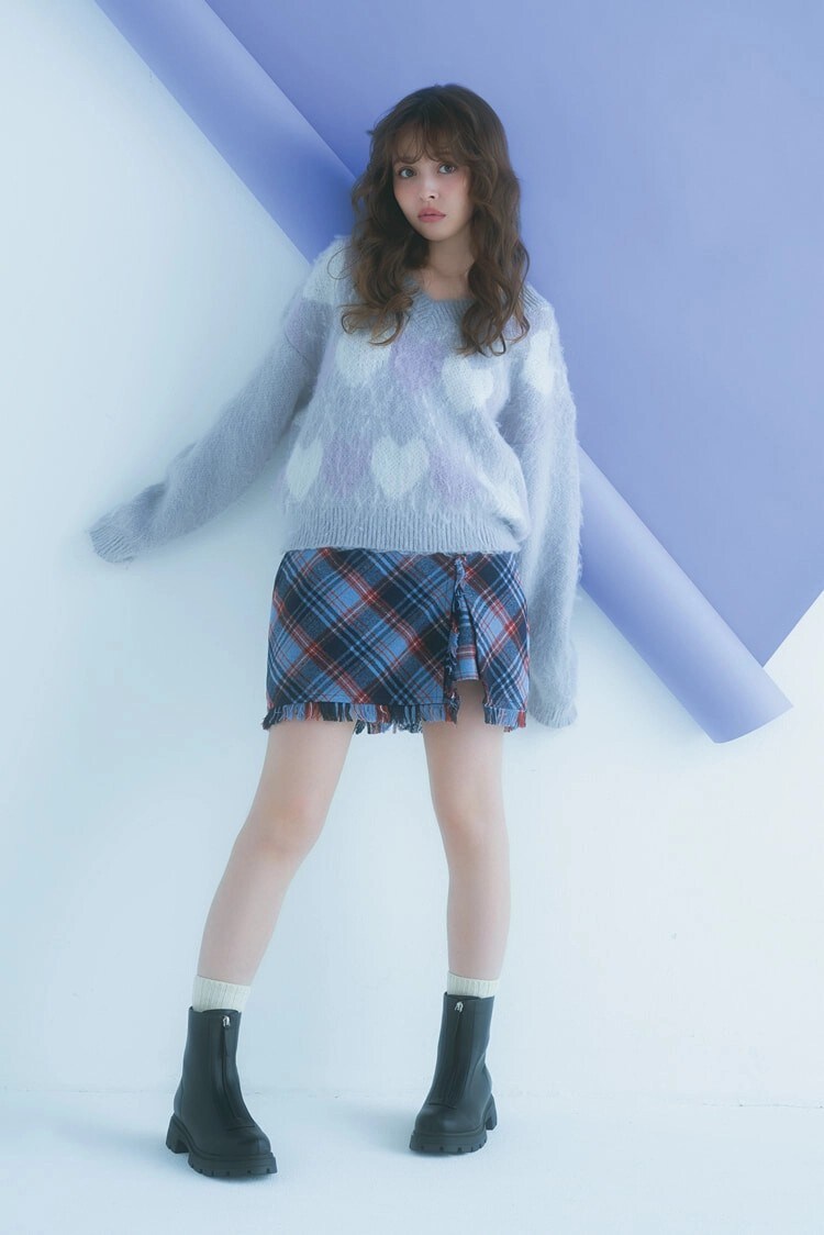 可愛らしさを与えてくれるハート柄は、ベーシックカラーなら挑戦しやすい。秋冬らしいチェックをあわせてトレンド感も意識。