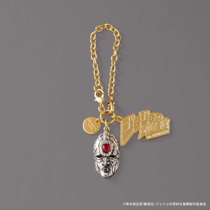 物語を象徴するアイテムを立体金具で表現したチャームも2種登場。「石仮面」チャーム(5,500円)は印象的なカタカナロゴを使用した金具プレートが存在感を放ちます。
