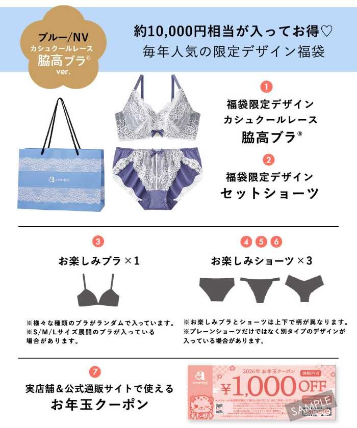 カシュクールレース脇高ブラ®福袋も内容は同様で、限定デザインブラ&ショーツ、お楽しみ単品ブラジャー1点、お楽しみ単品ショーツ3点、1,000円OFFクーポン、限定ショッパーバッグ付き。