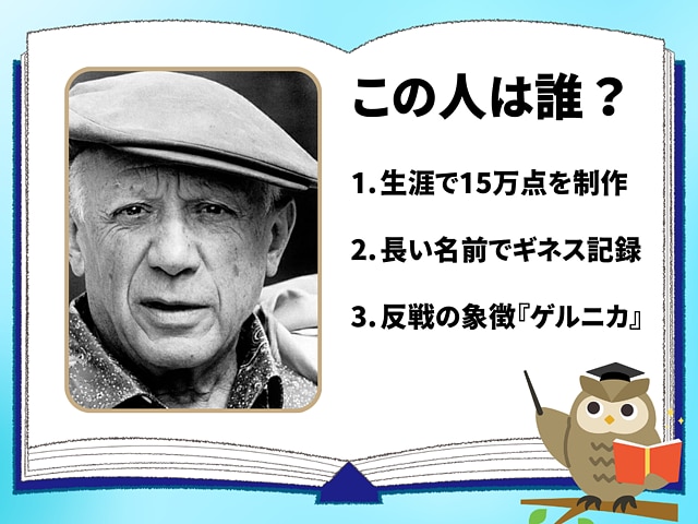 ちなみにフルネームは「パブロ・ディエゴ・ホセ・フランシスコ・デ・パウラ・ホアン・ネポムセーノ・マリーア・デ・ロス・レメディオス・クリスピン・クリスピアーノ・デ・ラ・サンディシマ・トリニダード・ルイス・イ・ピカソ」といいます。