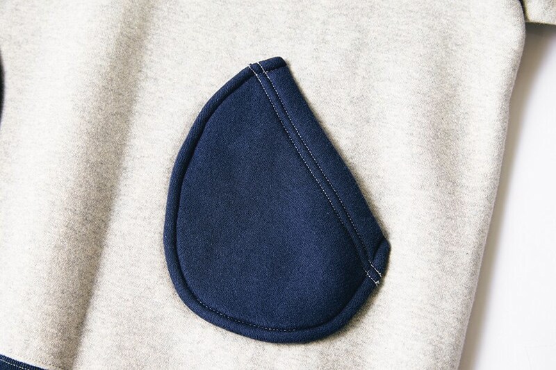 このボクシンググローブポケットが目を引くスウェットシャツは、Vガゼットの生地が前後で違っていたり、袖付けがフリーダムスリーブであったりと、細部にまでこだわりが詰まっています。そして個人的にいちばんのポイントは、バイカラーのデザイン。ベーシックなグレーのスウェットシャツに、首元、袖と裾のリブ、ポケットのネイビーが程よいアクセントに。先述したモノづくりへのこだわりも相まって、着ると背筋が伸びる気がします。もうスウェットがダル着だなんて、絶対に思いません。