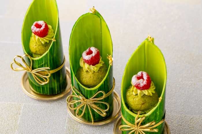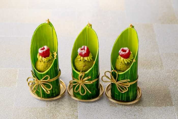 竹を模したホワイトチョコレートの器には、京都産宇治抹茶と酒粕、そしてフェルクリン社オーパス ホワイト 35%を使った濃厚で香り高いクリームが詰められています。