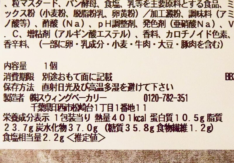 1個あたり401kcal、たんぱく質10.5g、脂質23.7g、炭水化物37.0g、食塩相当量2.2gです。