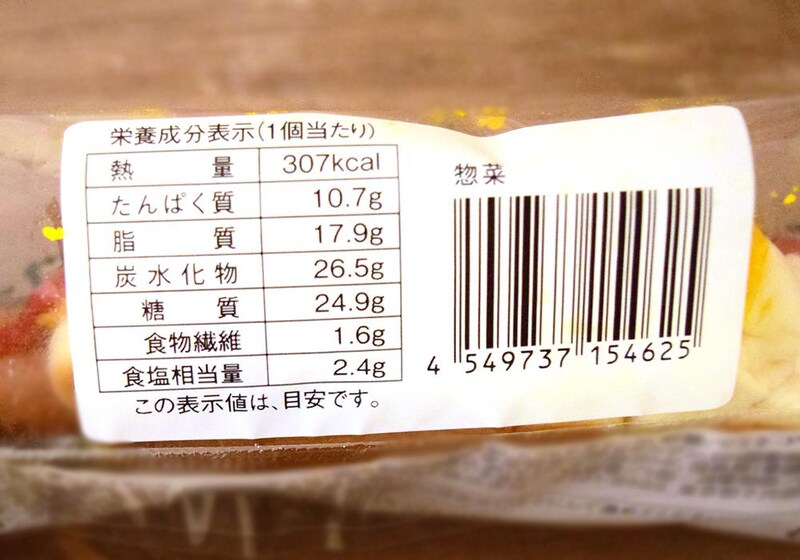 1個あたり307kcal、たんぱく質10.7g、脂質17.9g、炭水化物26.5g、食塩相当量2.4gです。