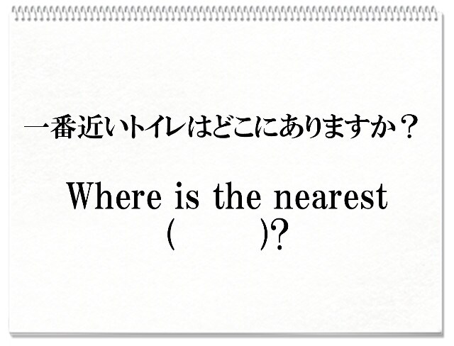 【答】 bathroombathroomは、主にアメリカで使う表現。「Where can I find the nearest ~?」も同じ意味に。デパートやショッピングモールでは「Restroom」と書かれた案内がトイレの位置を示していて、restroomでもOKです。