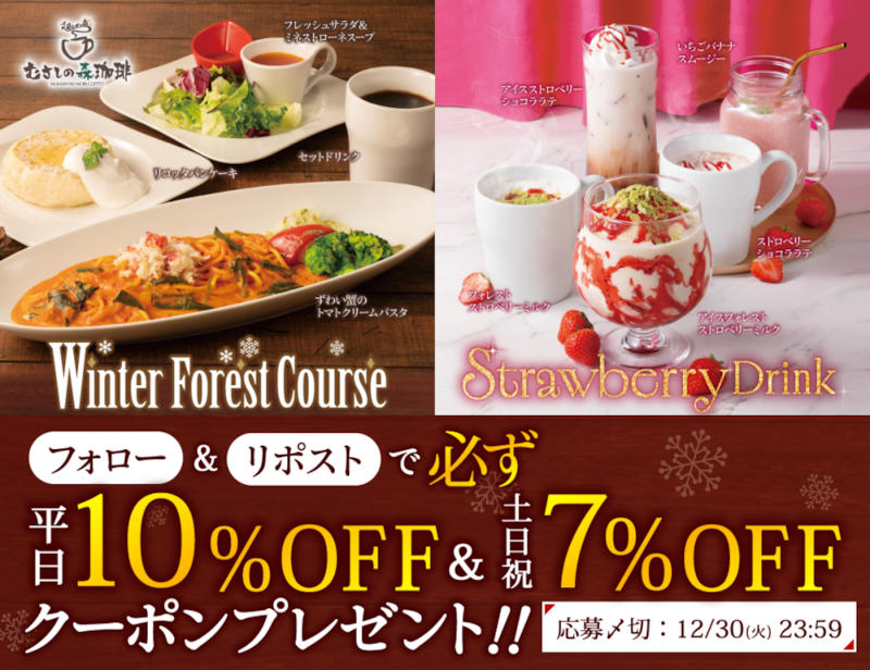 2025年12月23日現在、むさしの森珈琲の公式Xで最大10%オフのクーポンがもらえるキャンペーンを実施しています。