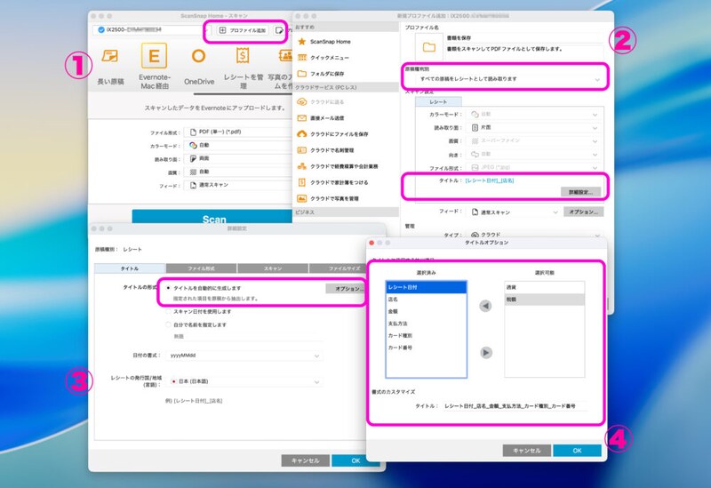 ②で読み込み書類をレシートに設定すると、③〜④のように読み取ったレシートのさまざまな名称をファイル名に使える。こうやって、ScanSnapのOCRで読み取ったデータをファイル名にしてGoogle Driveに入れるのがポイントだ。