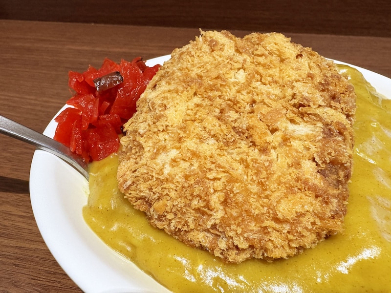 皆さんご存じとおり、万代バスセンターのカレーは粘度が高めで超ねっとりタイプ。その粘性あるカレーとメンチカツの衣が一体化。