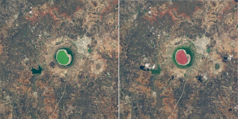 地球観測衛星ランドサット8号がとらえた、インドにあるロナール湖(ロナール・クレーター)の画像です。ロナール湖では緑色だった湖の水が、2020年6月上旬に急にピンク色へと変化しました。左は5月25日、右は6月10日に撮影された画像です。