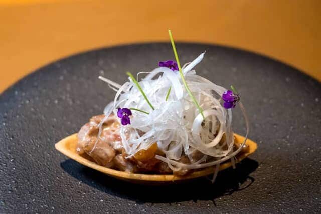 二品目はタルトレットをイメージした「牛タン / 卵黄 / ネギ」。しかもメニューにはない料理です。エッグヨーク(卵黄)で作ったタルタルで味付けされた牛タンは旨味とコクがあり、トッピングしたみずみずしい葱と山椒の辛みがアクセント。奥行きのある味わいが舌の上に広がりました。